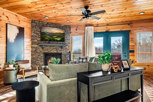 In the loft, you will find a third bedroom with two double beds, a FULL BATHROOM with tiled walk-in shower, and a high vaulted ceiling. You will also enjoy a comfy living area featuring a 70'' SMART TV, a custom-made bar, and a game area with a POOL table, Shuffleboard, FOOSBALL, 3 ARCADEs, and RING TOSS, providing perfect entertainment for all ages. Going out to the upper deck, you will find a GAS FIREPLACE to cuddle next to, 55" SMART TV, and SWING EGG CHAIRS overseeing the beautiful mountain view and the nature surrounding the cabin. This is a perfect spot for photo sharing!